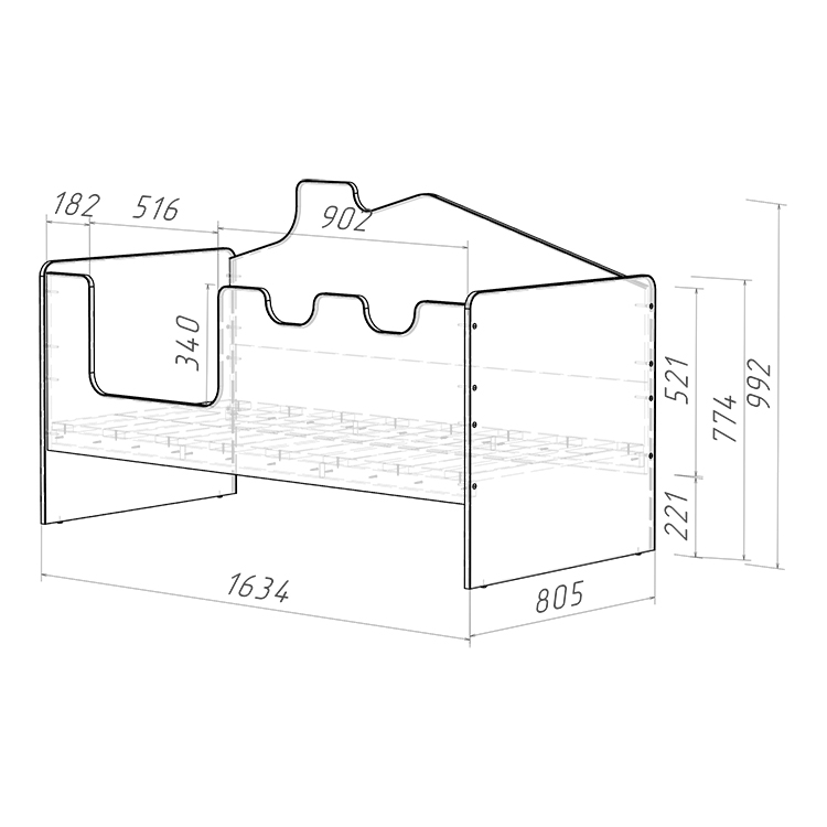Основное внимание уделено безопасности ребенка во время сна и игр. Высокие безопасные борта кровати (высотой 521 мм) обеспечивают надежную защиту от падений во сне, а отсутствие острых углов и мягкий противоударный кант повышают безопасность использования. Задний борт кровати стилизован под домик, что создает атмосферу игры и фантазии, стимулируя развитие ребенка.