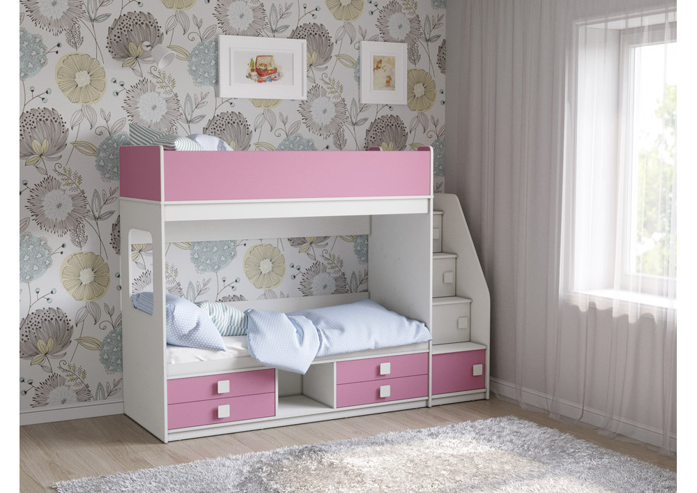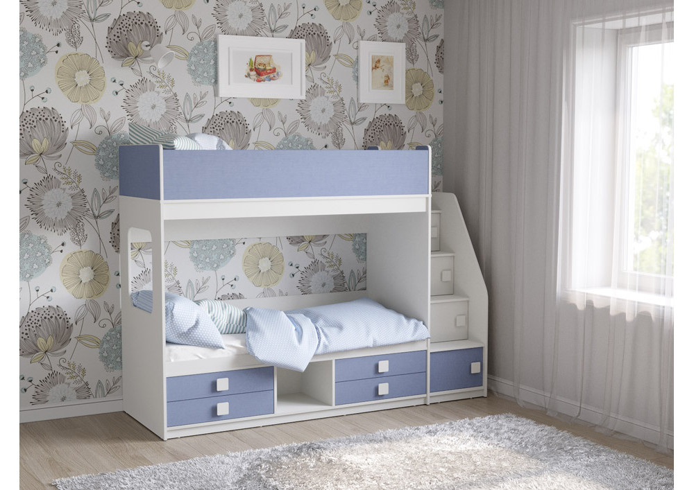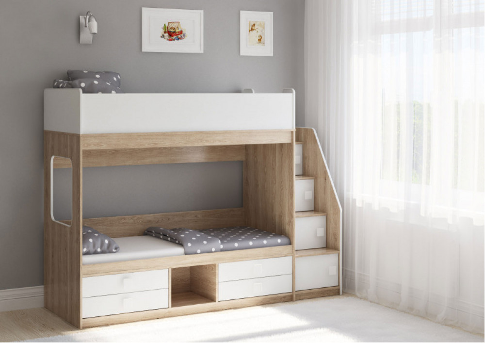 Классическая детская двухъярусная кровать с двумя параллельными спальными местами размером 1750х750 и 1900х750, выдвижными ящиками для хранения и угловой лестницей-стеллажем.